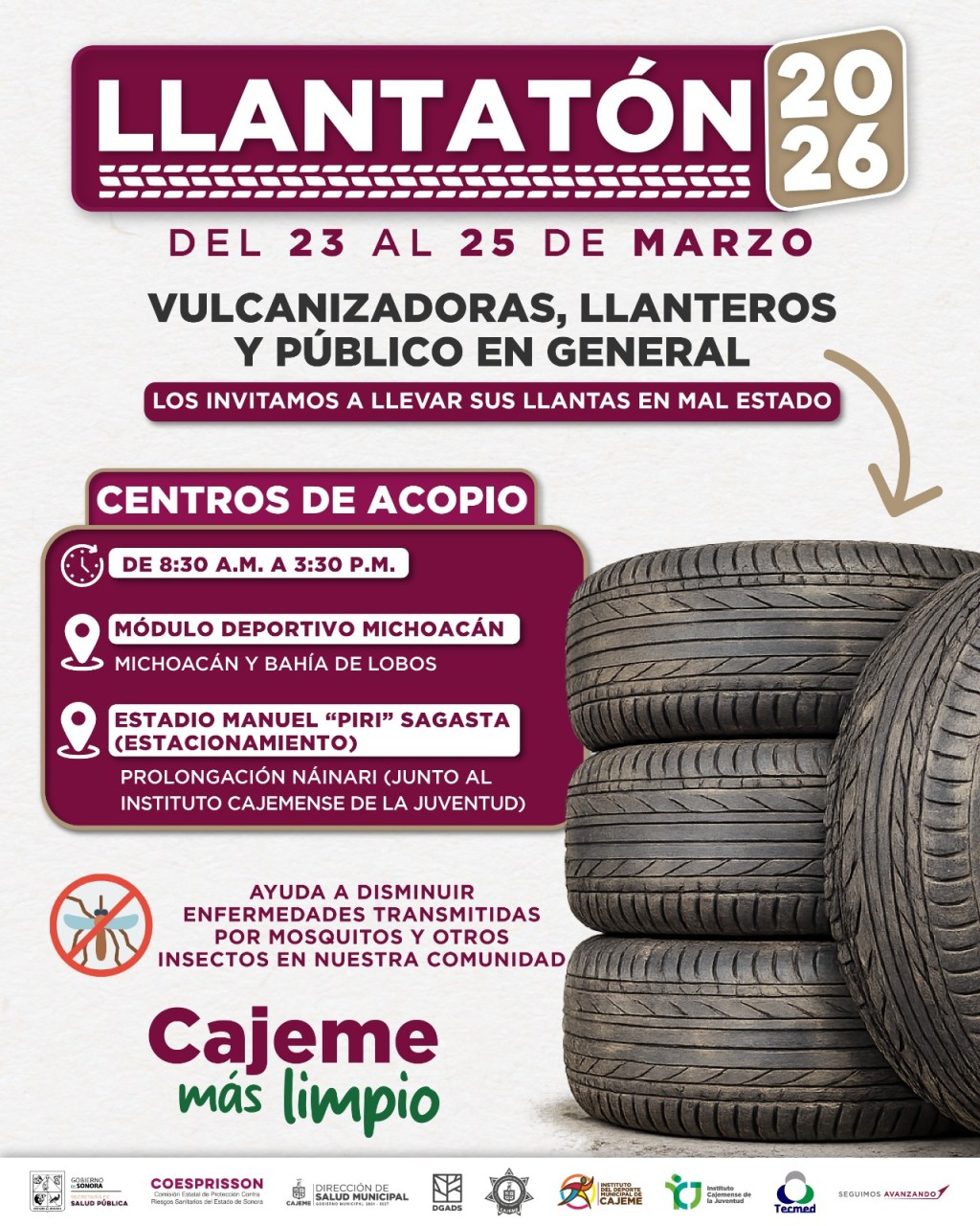 En el marco de las acciones internacionales y nacionales contra las arbovirosis, así como con el objetivo de fortalecer las acciones de salud preventiva y mantener un entorno más limpio, el Presidente Municipal de Cajeme, Javier Lamarque, invitó a la ciudadanía a sumarse al “Llantatón 2026”, llevando llantas en desuso a los centros de acopio habilitados en la ciudad.